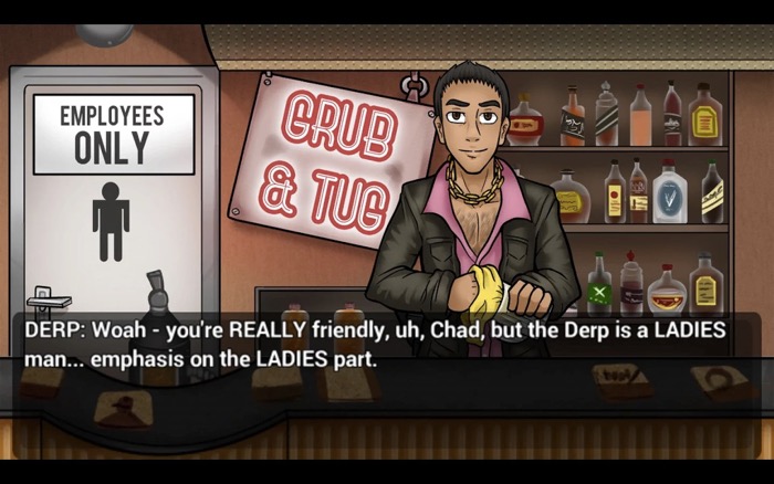 Sesuai kata “derp“alias bodoh yang terdapat pada bagian judulnya, di sini kamu akan menjumpai bermacam perbincangan konyol dengan ragam wanita berpakaian menggoda yang tak kalah dewasa dengan tema game Leisure Suit Larry.
